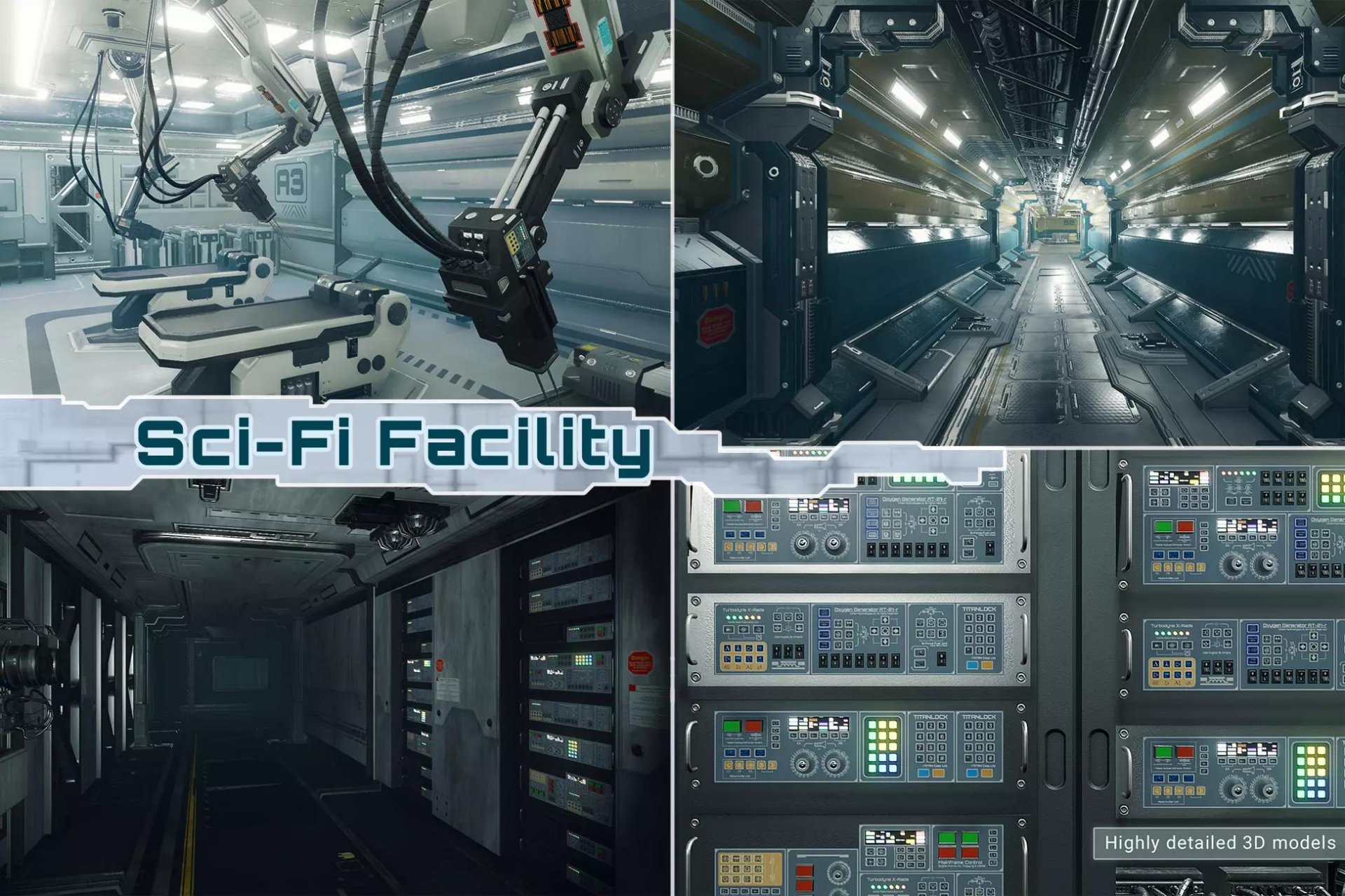 Sci-Fi Facility is a highly detailed environment kit for building the interior of a moon base or a space station. It is customizable and easy to adapt to your needs.